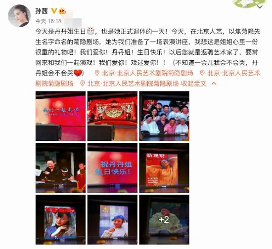 “今天是丹丹姐生日,也是她正式退休的一天!今天,在北京人艺,以焦菊隐先生名字命名的菊隐剧场,她为我们准备了一场表演讲座,我想这是姐姐心里一份很重的礼物吧!我们爱你!丹丹姐!生日快乐!以后您就是返聘艺术家了,要常回来和我们一起演戏!我们爱你!戏迷爱你!”