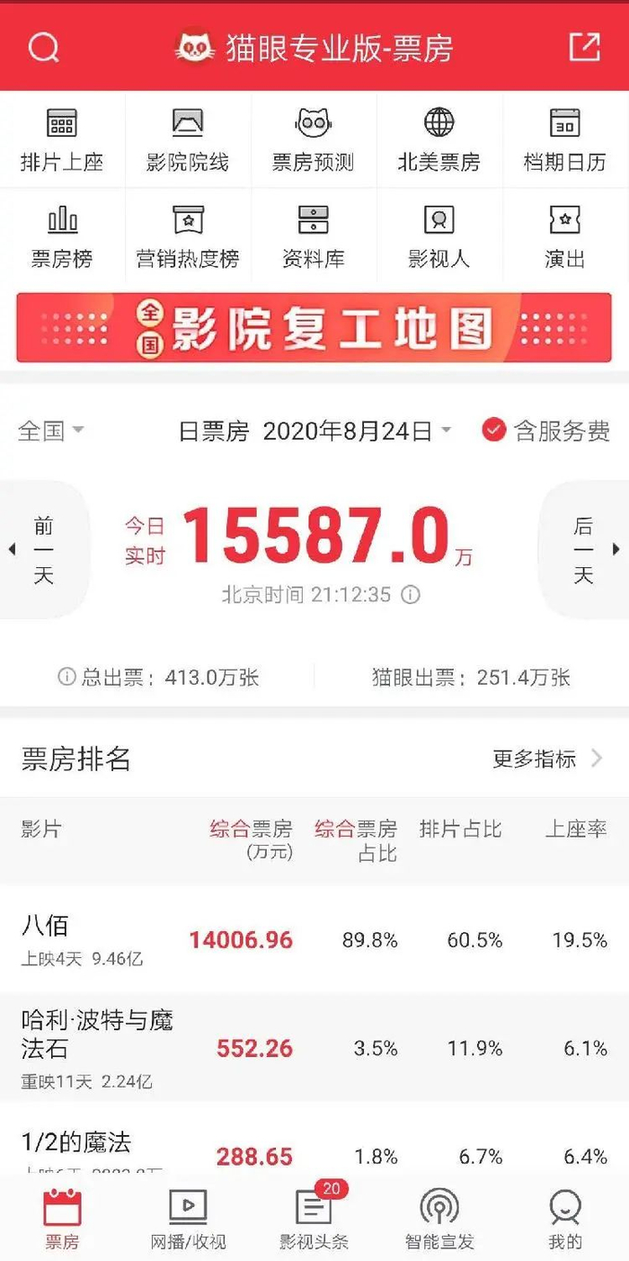 8月24日,根据猫眼平台数据,国产影片《八佰》票房突破9亿元,用时3天7时46分。作为影院复工以来的首个国产大片,这一成绩无疑显示出国内电影市场强劲的复苏力。