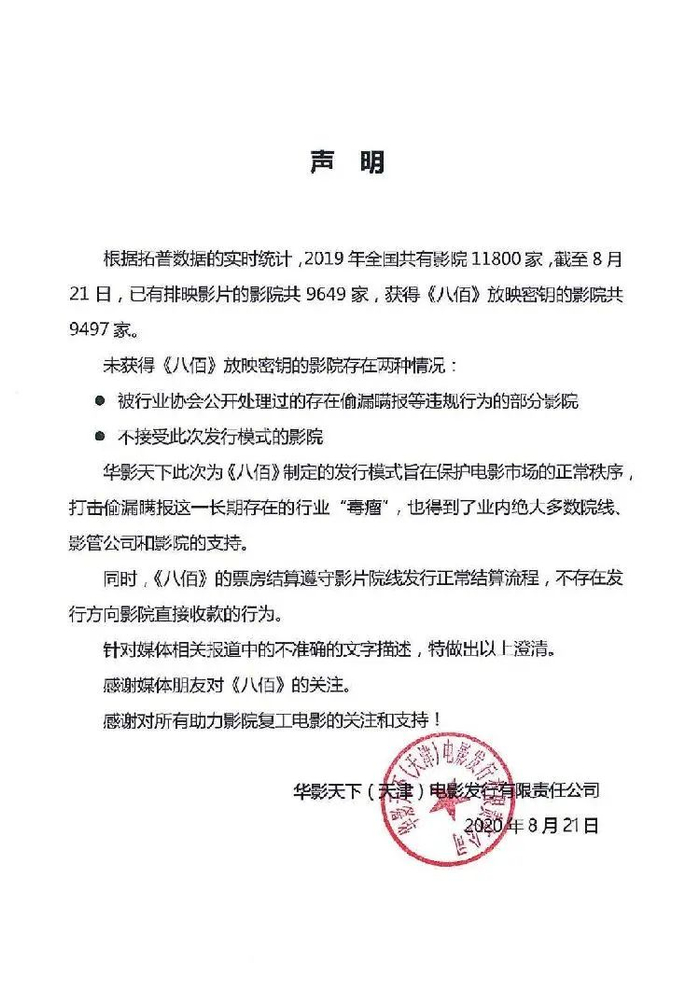 对于这一模式,华谊兄弟通过旗下华影天下回应,此次为《八佰》制定的发行模式旨在保护电影市场的正常秩序,打击偷漏瞒报这一长期存在的行业“毒瘤”,也得到了业内绝大多数院线、影管公司和影院的支持。同时,《八佰》的票房结算遵守影片院线发行正常结算流程,不存在发行方向影院直接收款的行为。