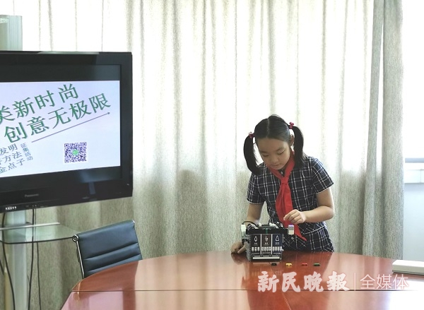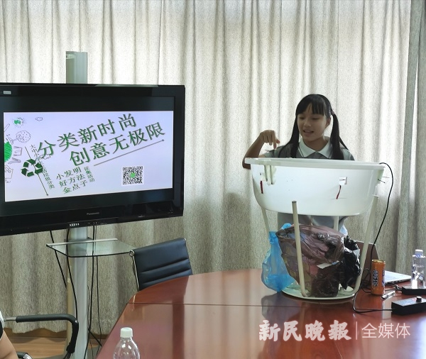 图说:愚一小学向红分校的刘一睿带来了“小区自动感应破袋防虫隔臭湿垃圾箱” 新民晚报记者 金旻矣摄(下同)