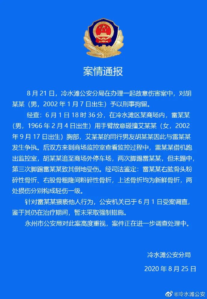 今年6月1日,湖南永州一17岁女生在商场被一52岁男子雷某某用肘部袭击胸部,同行男同学胡某某在制止其逃跑时,将其踹伤。事后雷某某被行政处罚,胡某某因涉嫌故意伤害(轻伤)罪于8月21日19时被刑事拘留。