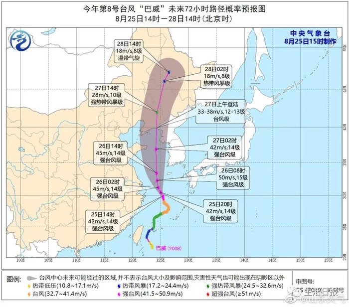 今年第8号台风“巴威”将于27日上午在朝鲜西部到辽宁东部一带沿海登陆(台风级),受其影响,近日中国东部海区将有8-12级大风,“巴威”中心经过的附近海域风力可达13-15级,东北地区大部以及山东中东部、江苏北部等地自南向北先后有大到暴雨。国家防办向相关地区防指发出通知,要求切实做好防汛防台风工作。