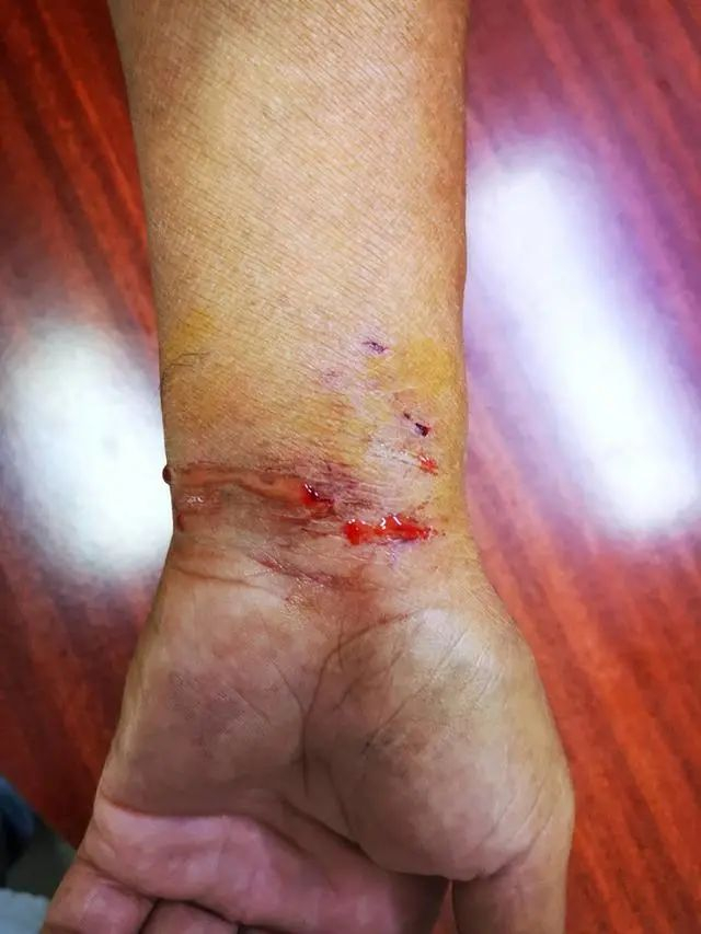 皮肤科曾武城医生说,患者左臂有明显的牙印,和蛇咬伤的伤口相比,狗咬伤的伤口更加明显,伤口出现了肿胀,还有渗水和渗液。血液检查结果显示,炎症指标、磷酸肌酸激酶等都偏高。
