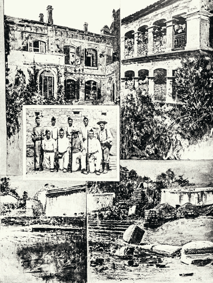 驻京公使馆的军事行动。根据翟兰思和邦迩拍摄的照片绘制。1. 德国一等秘书宅邸遭炮击后被毁坏。2. 英国一等秘书宅邸搭建起街垒以抵御炮击。3. 守在翰林院(Han Lincollege)街垒上的英国水兵,他们来自“奥兰多”号。4. 由英军守卫的日军防线遭炮击后被摧毁。5. 日军防御工事遭炮击后部分被摧毁。
