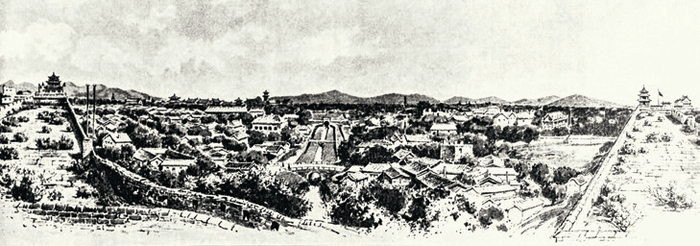 站在分隔内城与外城的城墙上俯瞰北京内城。根据雷(E. Wray)的速写绘制。