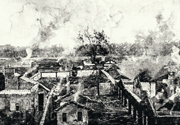 北京城内的大火。美国公使馆附近的民居遭焚毁。根据翟兰思拍摄的照片绘制。