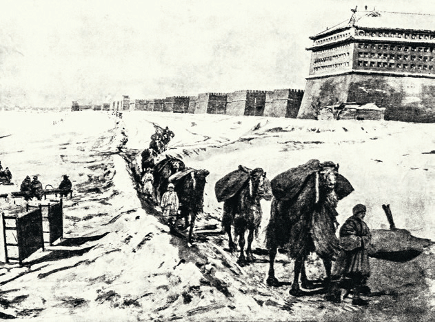 冬季,北京城外运货的骆驼。根据立德(Archibald Little)夫人拍摄的照片绘制。