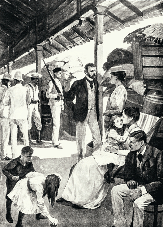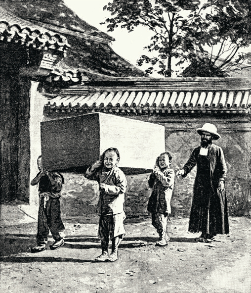 一位主母会传教士指挥男孩搬运掠夺来的物品。根据一位记者拍摄的照片绘制。
