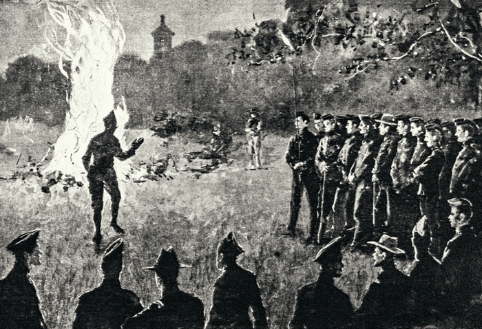 在天坛庆祝阿尔马河战役胜利日。英国皇家炮兵第12团(12th Battery,R.F.A.)当时占据着天坛。根据莱昂内尔·巴夫先生的速写绘制。