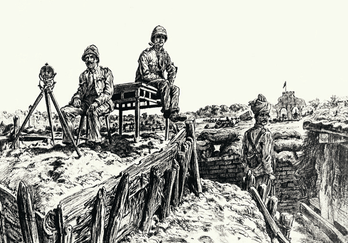 英属印军首次攻入北京城。根据本报特约画家约翰·舍恩伯格的速写绘制。