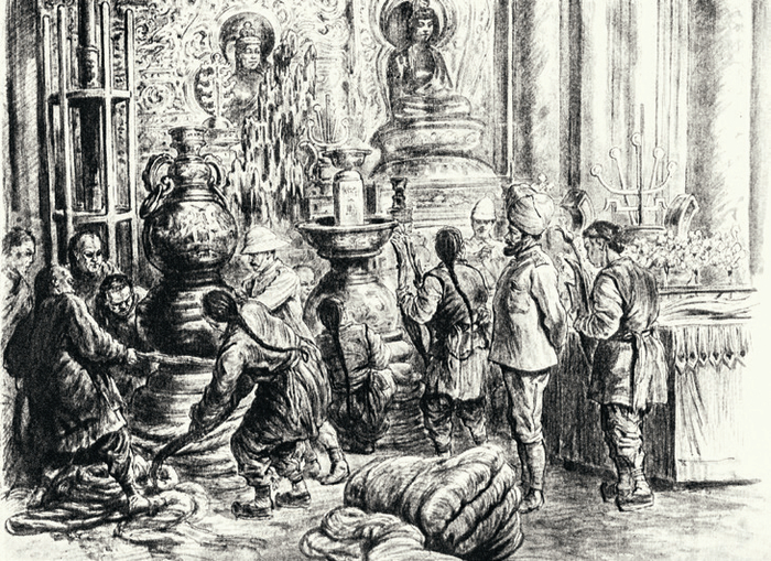 近期,对攻占北京时发生的抢劫事件的报道铺天盖地。毫无争议的是,这种大规模的掠夺行为获得了联军上层的允许,不过关于这一行为是否站得住脚的问题已经引起了许多人的关注。最近,一大批掠夺所得的财宝刚刚运抵马赛,就被法国政府迅速送回清朝。《生活画报》(La Vie Illustrèe)的卢西安·勒罗伊(Lucien Leroy)最近刚从北京回来。他带来的照片显示,联军一进北京,就开始掠夺珍宝。有趣的是,这位法国记者(从他的照片中我们找出了3幅做成了插图)对这个问题的看法。首先必须指出的是,他在批评中并未宽恕自己的同胞。他主要介绍了联军对太庙的掠夺。他在文章中指出,传教士和清朝基督徒都参与到了劫掠之中。在他的一张照片中,一位主母会(Marist)传教士雇了一些当地男孩——他的学生—— 搬运一大包战利品,它们是弗雷将军运往法国的70辆马车战利品中的一部分。勒罗伊先生毫不犹豫地说,掠夺似乎是联军的首要目标。他把这次远征比作1839年和1860年的远征。在1860年的远征中,英法联军将圆明园洗劫一空。樊国良主教最近也从北京回来。针对进入普通百姓家抢劫这一问题,他坚决地为自己在清朝的教友辩护,并宣称,如果一些基督徒在他不知情或者违背主教命令的情况下,以任何方式抢劫了清朝家庭的财产,他将会做出必要的补偿。