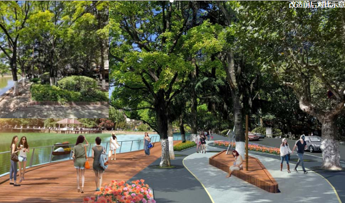 新增两处公共厕所,并对现有公厕检修,改造外立面。西山段延续篆塘段栏杆样式,与照明设施统一。沿线间隔200米布置分类垃圾桶。检修、翻新现状休息座椅。统一全段导视标牌样式,结合大观文脉,体现文化符号。梳理下层植物,补种开花地被,改造花池形状,与道路铺装统一,打造沿线精致花池景观,展示春城花都形象。