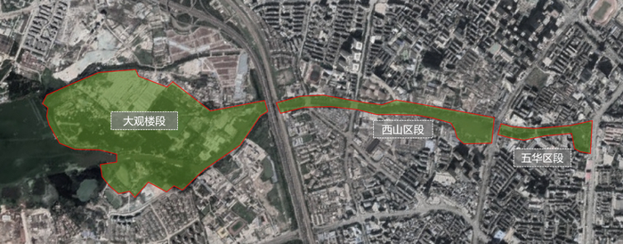 大观河河道建设范围从篆塘公园开始,到草海大观楼公园结束,包括大观路、新闻路、篆塘路的道路景观改造以及大观公园整体改造提升。