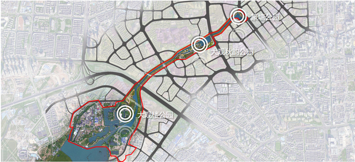 对沿线篆塘公园、秋园、大观楼公园三处大型公共空间节点进行改造提升,打造三点一带的整体景观结构。