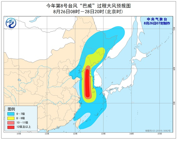 大风预报:26日至28日,受台风“巴威”影响,我国东部及北部海域、辽宁东部沿海、山东半岛东部沿海风力有8~11级,台风中心经过的附近海域风力可达12~15级,阵风16~17级;台风登陆点及附近海域12~13级大风,阵风14~15级;东北地区陆地普遍有6~8级阵风,辽宁东部与吉林东南部阵风将有9~10级大风,局部11~13级。