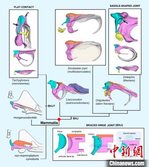此前解剖学、发育生物学、遗传学的大量研究证明,哺乳动物的听骨和爬行动物的齿骨后骨和方骨具有同源关系。古生物学也早已提出中耳渐进演化假说,即从爬行类向哺乳动物的典型哺乳动物中耳的演化过程中,齿骨后骨逐步缩小,并与齿骨分离,最终移入颅基部,成为专司听觉功能的结构。但因纤细的听骨很难保存为化石,近200年来发现的中生代哺乳动物中耳化石极少,其形态细节和关节方式一直不清楚,对其演化过程和机制的解释存在极大的人为性,各种推论、假说存在较大争议。