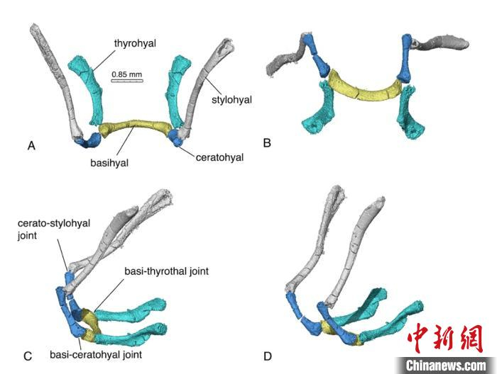 毛方园透露,除完好的听骨外,潘氏中华俊兽化石还保存了迄今最完整的中生代哺乳动物舌骨悬器。合作团队通过CT扫描重建的方式,首次以三维形态呈现该舌骨悬器:由单根的基舌骨,成对的角舌骨、茎舌骨和甲舌骨,组成类似现生哺乳动物的鞍状舌骨结构。其灵活的关节模式表明,此阶段多瘤齿兽已具有吞咽和吸吮的可能性。(完)
