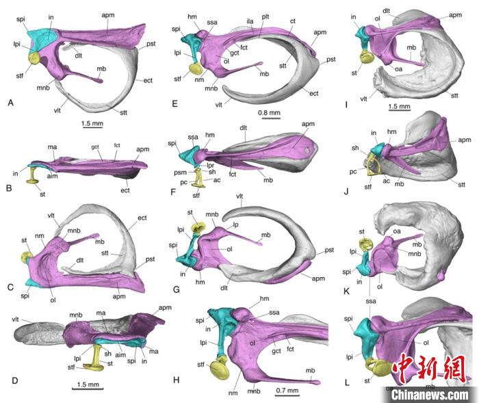 她表示,合作团队对采自辽宁朝阳的多瘤齿兽——潘氏中华俊兽保存完好的听骨化石进行高精度CT扫描重建,首次揭示出多瘤齿兽5块听骨确切的三维形态和接触关系:中华俊兽具典型哺乳动物中耳,听骨与齿骨已完全脱离并进入颅基部;外鼓骨与锤骨组成趋于完整的卵圆形框架以支撑鼓膜;锤骨发育锤骨柄、基、颈等进步特征;上隅骨与锤骨前支依然由骨缝分隔,但后端骨体愈合,共同参与锤骨-砧骨关节;砧骨体仍保持与锤骨大致前后向而非背腹向的关节方式;砧骨具长短突,长突末端与双腿的镫骨相关节。