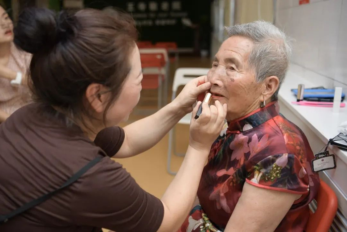 “从敬老院院长口中得知这个活动,我第一时间就报名参加了,虽然我是开美容院的,但是从没给妈妈化过妆。”女儿周雅妮说,母亲是农民,一生朴实,以前也想给她打扮,但她总是拒绝,这次终于同意了,自己一大早就带上化妆品还有一件旗袍赶到敬老院。