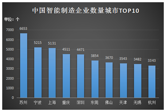 6.【企业分布】据《世界智能制造中心发展趋势报告(2019)》报告显示,智能制造企业数量排前十的城市,分别是苏州、宁波、上海、重庆、深圳、东莞、佛山、天津、无锡和杭州。其中苏州数量最高达6653家;宁波和上海旗鼓相当,分别为5215家和5131家。