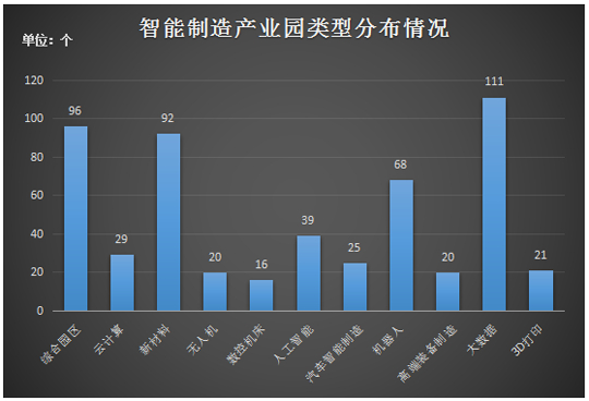 在智能制造的产业链上,云计算、大数据和人工智能技术的发展成为智能制造业发展的底层驱动力,是智能制造系统具备“数据采集、数据处理、数据分析”能力的基础设施。近年来,大数据产业园也是数量最多的产业园类别,达到111个。其次是综合园区,达到96个。新材料园区为智能制造产业发展提供了“物质引擎”,应用非常广泛,产业园区达到92个。
