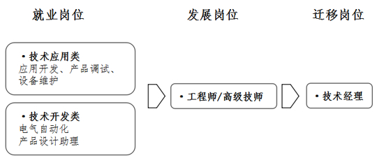 智能制造工程技术人员根据就业岗位的职责分为技术应用类和技术开发类,是贯穿智能制造企业从产品开发、应用调试到售后维护整个过程的重要角色。对个人而言,工程技术人员在经历岗位历练和技能水平提升后,可晋升工程师/高级技师。