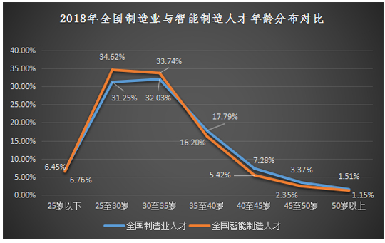 对比智能制造与制造业人才年龄分布情况可以看出,智能制造人才在25至30岁、30至35岁年龄段的人才占比高于制造业,35至40岁、40至45岁、45至50岁、50岁以上年龄段的人才比例均低于制造业,说明从事智能制造岗位的年轻人比传统制造业更多,年龄优势能给智能制造的发展带来更多的想象空间。