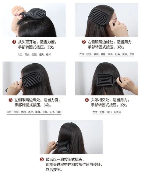 梳齿顶端有仿八爪鱼足部的圆点按摩珠,通过刺激、按摩头部穴位。