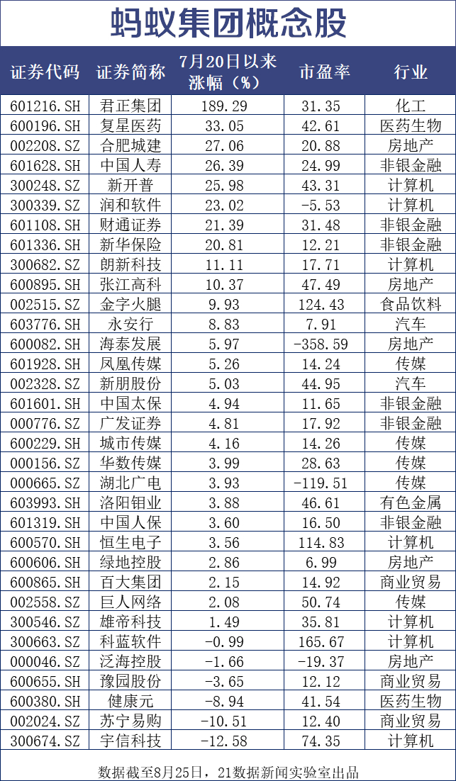 据21数据新闻实验室统计,蚂蚁上市后,阿里系合计持股69.69%,社保基金持有2.33%的股权,中国人寿(601628.SH)、太平洋人寿(601099.SH)、人保资本(母公司中国太保601601.SH)、新华人寿(601336.SH)四大保险集团合计持有2.35%。