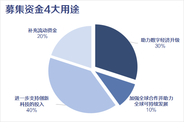 其中,40%将用于进一步支持创新和科技的投入,30%助力数字经济升级,10%加强全球合作并助力全球可持续发展,剩下的20%用来补充流动资金。