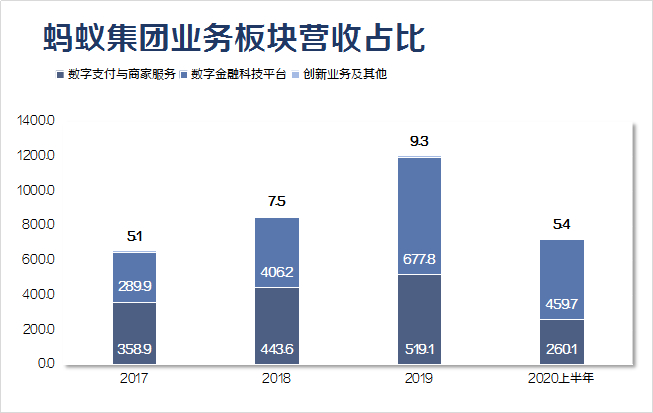 从营收来源看,2020上半年三大业务板块(数字支付与商家服务、数字金融科技服务、创新业务及其他)分别占35.86 %、63.39%和0.75%。