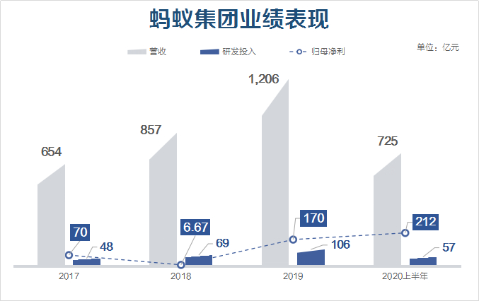 这种增长势头,在全球新冠疫情背景下依然没有改变,2020年上半年,蚂蚁营收达到725.28亿元,同比增幅超过38%,净利润为212亿元,超去年全年,平均日赚1.16亿元。