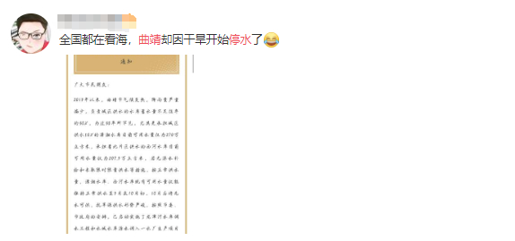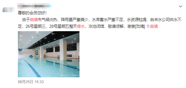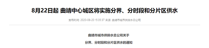 8月19日,曲靖市城市供排水总公司发布停水通知,从8月22日起,曲靖中心城区分界、分时段、分片区供水。