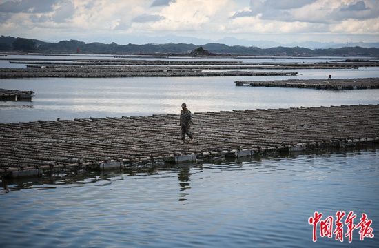 7月23日,广西钦州市茅尾海大蚝养殖基地,工人郭太钟行走在吊养大蚝的浮筏上。他是龙门港镇南村渔民,鱼获减少后转行做养殖,每月能有七八千元的收入。