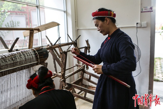 7月22日,广西崇左市龙州县城南幸福家园社区金龙壮锦扶贫车间,村民李素芳(右)在缠纬线。这里让搬迁户能够在家门口实现就近就业,工人每月能有1000-2000元收入。作为龙州县城南易地扶贫搬迁安置点,城南幸福家园目前已安置入住551户共2316人,其中建档立卡贫困户525户。