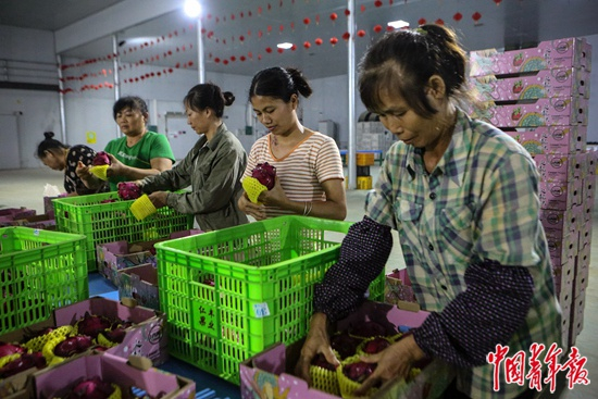 7月21日,广西南宁市隆安县丁当镇保湾村一家火龙果基地分拣车间里,女工们正在将洗净分拣后的火龙果贴标签装箱。虽然这里的火龙果生产种植已基本实现自动化,但采摘、护理和后期的清洗、分拣、包装都需要大量人工,为附近村民提供了不少就业机会。
