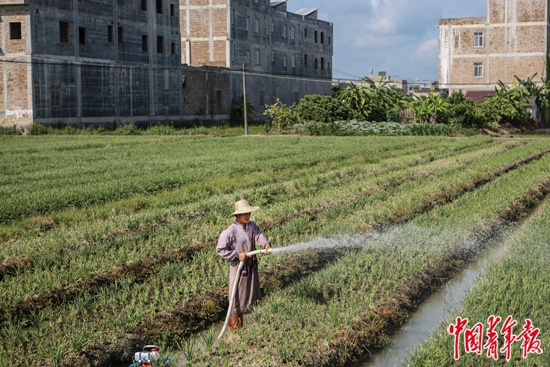 7月25日,广西玉林市陆川县珊罗镇田龙村,一名村民在给田里的韭菜浇水,远处是修建中的新房。近年来,通过打造有机韭菜等多个特色扶贫产业,建设特色风景旅游区,田龙村建档立卡贫困户106户全部脱贫,乡村风貌也得到了提升。在广西,还有许多乡村也像这样走向小康之路。