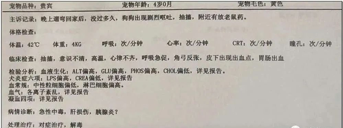 肖女士提供的宠物医院病历显示,前述泰迪犬的病情诊断为:“急性中毒,肝损伤,胰腺炎?”