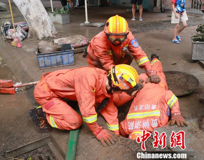 图为消防员在现场开展清淤、排涝工作。谢金彬 摄
