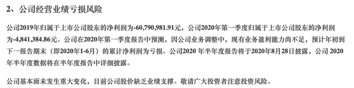 天山生物近年持续亏损。财报显示,天山生物2019年归属于上市公司股东的净利润为-6079万元,2020年第一季度归属于上市公司股东的净利润为-484万元。天山生物在2020年第一季度报告中预测,因公司业务调整中,现有业务盈利能力尚不足,预计2020年1月至6月的累计净利润为亏损。