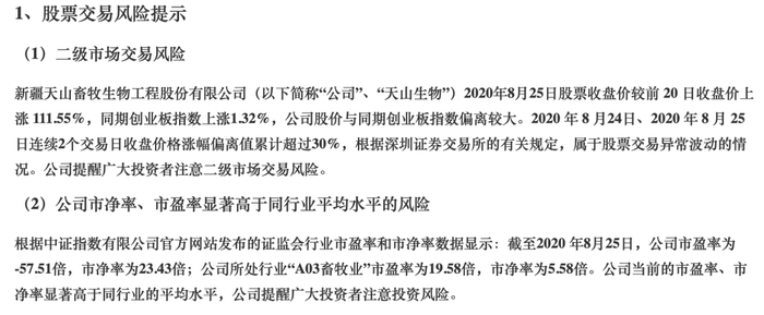 此外,天山生物还将市净率、市盈率等,分别于同期创业板表现和同业公司进行比较,以提醒投资者注意风险。
