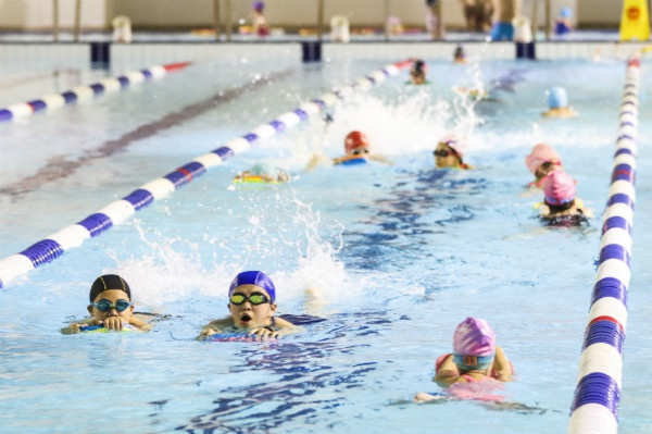 图说:游泳馆内孩子们正在上游泳课