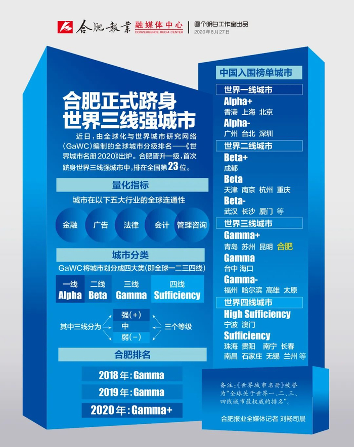 近日,由全球化与世界城市研究小组与网络(GaWC)编制的全球城市分级排名——《世界城市名册2020》正式出炉。作为全球最著名的城市评级机构之一,GaWC自2000年以来不定期发布的《世界城市名册》,被誉为“全球关于世界一、二、三、四线城市最权威的排名”。记者梳理名单发现,合肥位列此次榜单中的Gamma+,即世界“三线强”城市行列中。