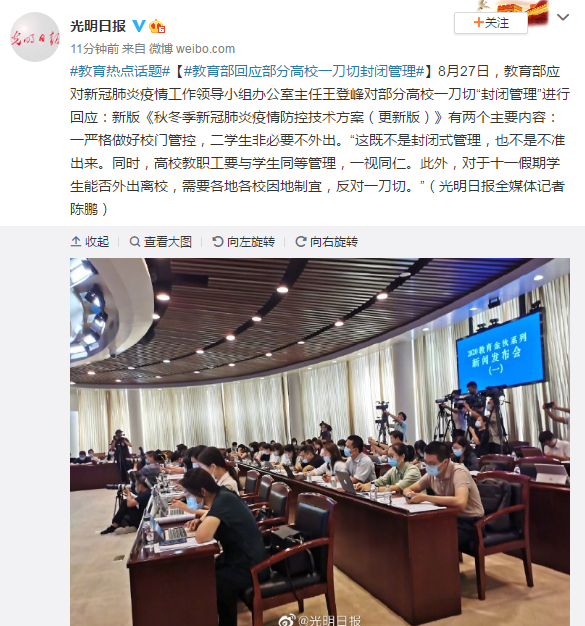 王登峰对部分高校一刀切“封闭管理”进行回应:新版《秋冬季新冠肺炎疫情防控技术方案(更新版)》有两个主要内容:一严格做好校门管控,二学生非必要不外出。“这既不是封闭式管理,也不是不准出来。同时,高校教职工要与学生同等管理,一视同仁。此外,对于十一假期学生能否外出离校,需要各地各校因地制宜,反对一刀切。”