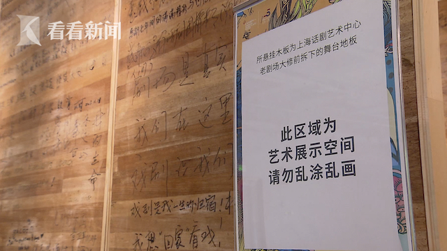 看看新闻Knews记者在话剧艺术中心看到,通往三楼剧场的楼梯口已经暂停开放,受损的艺术装置就摆放在三楼剧场外。 它由五块地板组成,上面有三四百个签名和留言。2017年11月18日,话剧艺术中心大修前,特别邀请艺术家和观众,在三楼剧场地板上签名,奚美娟、吕凉、徐峥、马伊俐等演员都留下了签名和祝福。去年5月份剧场完成大修、重新开放后,这些地板经艺术处理,成为一件悬挂起来的装置作品。