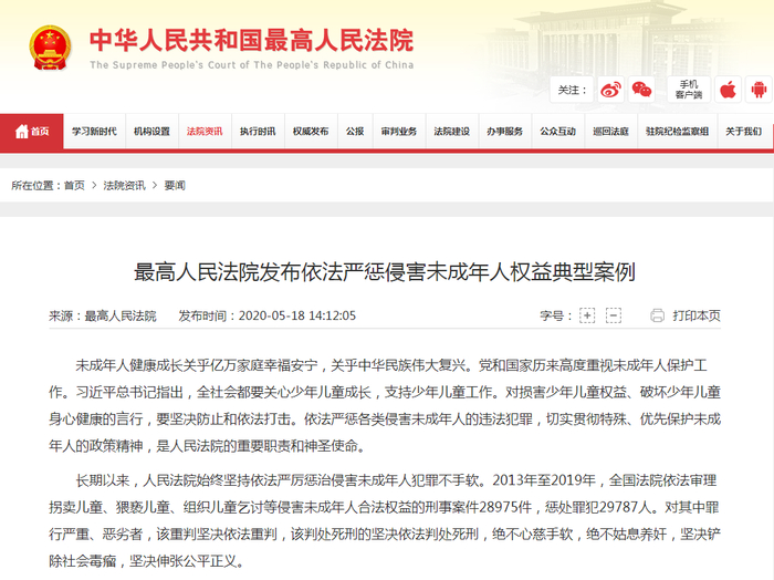 性侵未成年人案件时有发生,如何保护未成年人免遭侵害一直是全社会关注的焦点,而从重处罚也一直是网友的呼声。5月18日,最高人民法院发布七起依法严惩侵害未成年人权益典型案例,并表示对侵害儿童权益的案件中罪行严重、情节恶劣者,该重判坚决依法重判,该判处死刑的坚决依法判处死刑,绝不心慈手软,绝不姑息养奸。