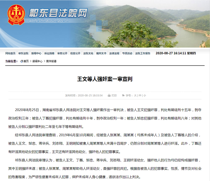 据湖南省祁东县人民法院8月25日消息,2020年8月25日,湖南省祁东县人民法院对王文等人强奸案作出一审判决,被告人王文犯强奸罪,判处有期徒刑十五年,剥夺政治权利三年;被告人丁磊犯强奸罪,判处有期徒刑十年,剥夺政治权利一年;被告人邹忠犯强奸罪,判处有期徒刑八年;对其他被告人分别以强奸罪判处二年至七年不等有期徒刑。