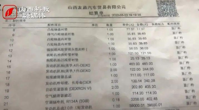 在4S店出具的结算单上写着,维修费用共计52222元,其中发动机总成的价格为39000元,其余项目共计13000余元。