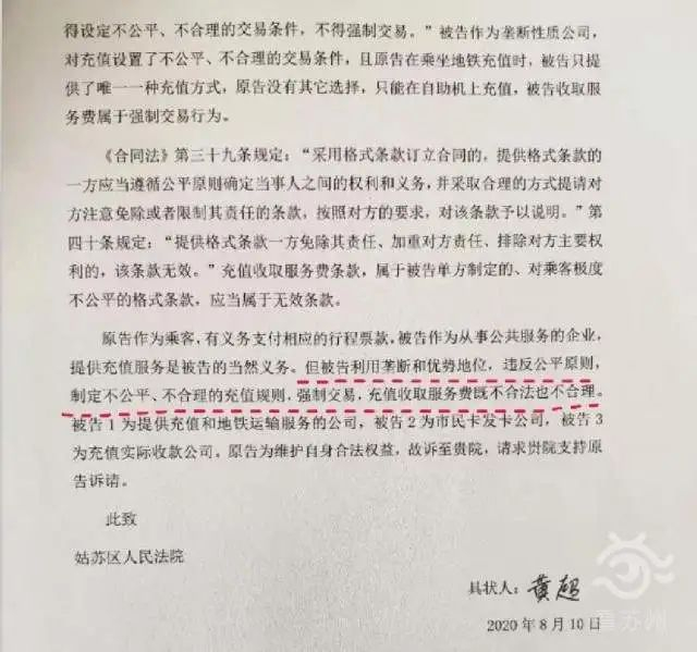 作为法律人,黄超认为此举不公平也不合理,希望以诉讼推动这件事。8月10日当天,黄超一纸诉状将苏州轨交公司、公交卡发行公司和充值实际收款公司告上了法庭。