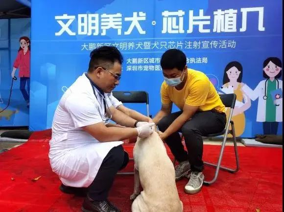 8 月 26 日下午,由大鹏新区城市管理和综合执法局主办的"文明养犬 · 芯片植入"宣传活动在佳兆业广场开展,当天共有 35 只犬只注射了芯片。据悉,10 月起,深圳犬只未植入芯片将视为无证养犬。大鹏新区城管局呼吁养犬市民,在规定期限内主动前往指定机构注射芯片。